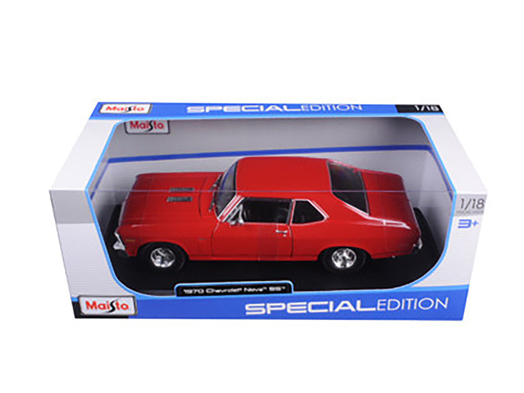 Brand new 1/18 scale diecast car model of 1970 Chevrolet Nova SS Coupe Red die cast model car by Maisto. Brand new box. Real rubber tires. Has steerable wheels. Officially licensed product. Opening hood, doors and trunk. Made of diecast with some plastic parts. Detailed interior, exterior, engine compartment. Dimensions approximately L-10, W-4, H-3 inches. Please note that manufacturer may change packing box at anytime. Product will stay exactly the same.