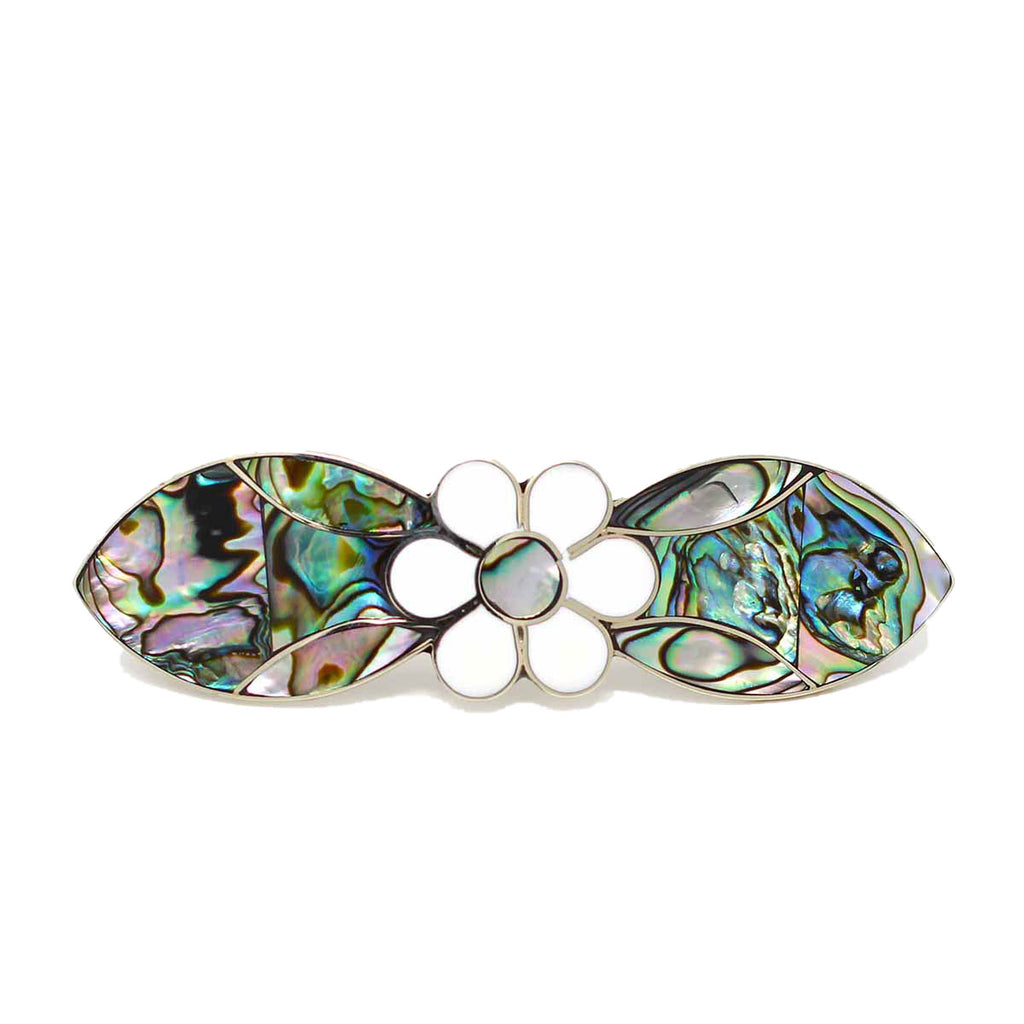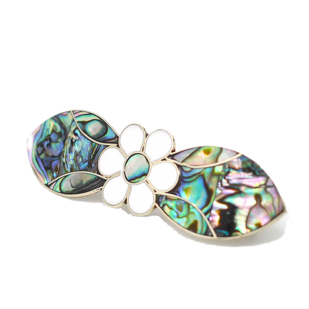 This mother-of-pearl artistically arranged in the shape of a Daisy and Abalone inlaid in alpaca silver barrette measuring 3 1/2 by 1 inch. Squeeze spring closure.