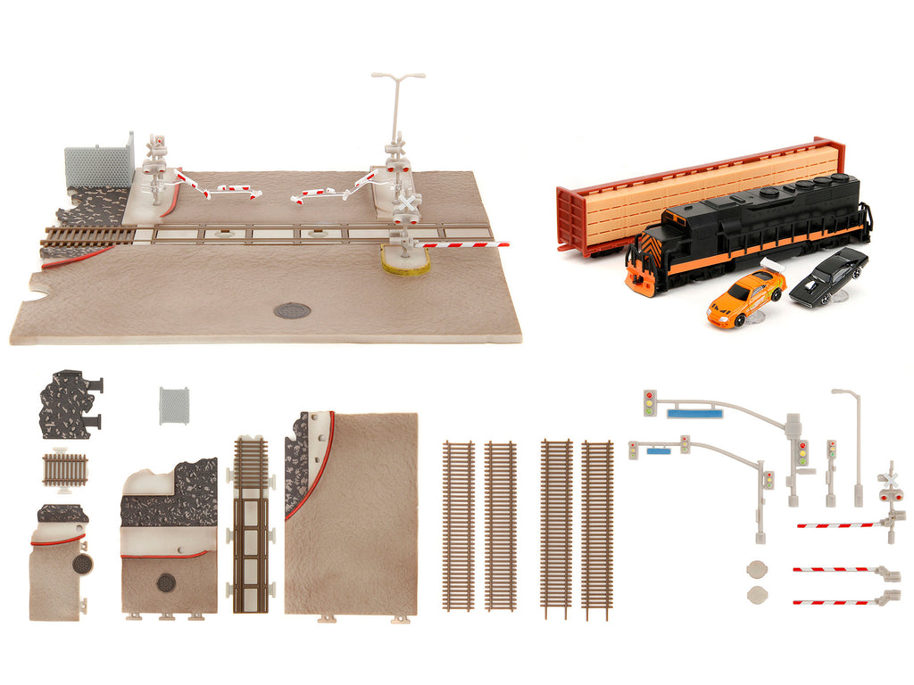 Brand new scale model of "Fast & Furious" Final Race Diorama with Toyota Supra Orange and Dodge Charger Black "Nano Scene" Series model by Jada. Brand new box. Real rubber tires. Detailed exteriors. Officially licensed product. Manufacturer's original unopened packaging. Made of diecast metal with some plastic parts. Car dimensions approximately L-1.5 inches long. Assembled Diorama dimensions approximately L-12, W-5.75 inches. Includes train with tracks to set up the final scene from the first movie. Please note that manufacturer may change packing box at any time. Product will stay exactly the same.