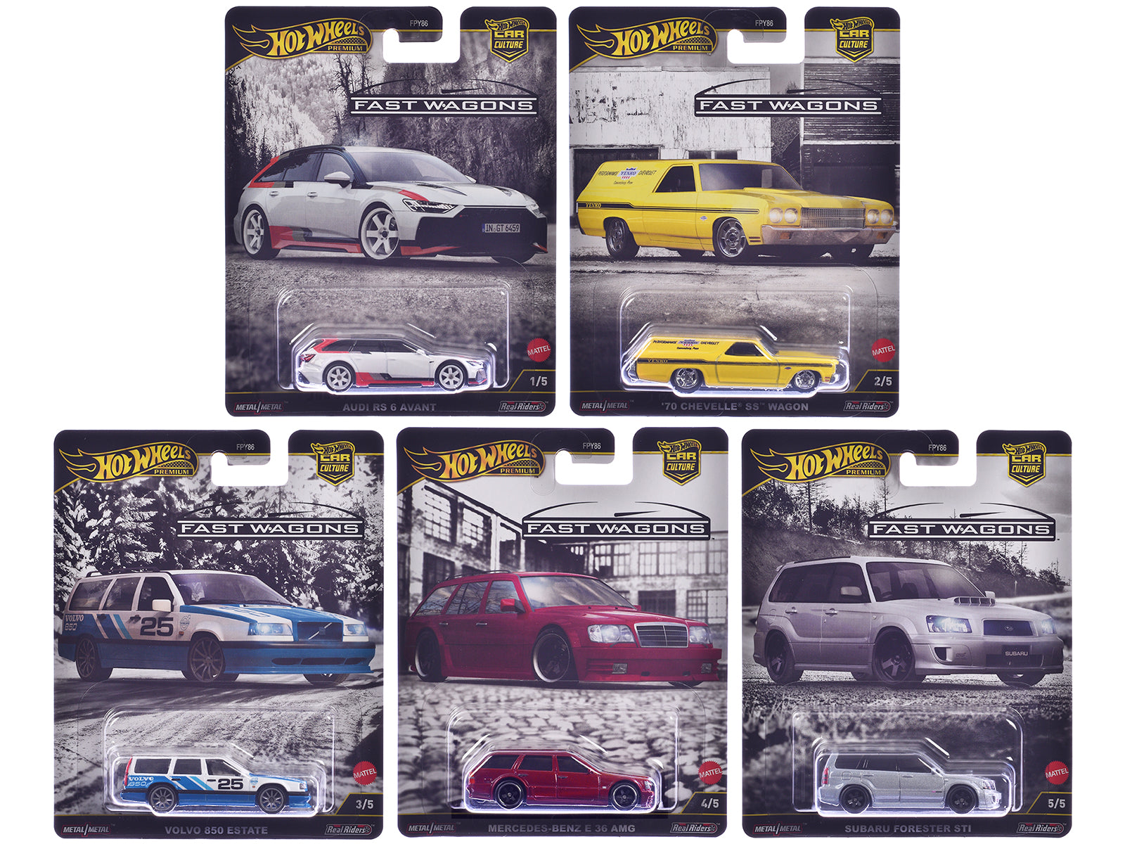 Brand new diecast car models of "Fast Wagons" 5 piece Set "Car Culture" 2024 Series J die cast model cars by Hot Wheels. Brand new boxes. Real rubber tires. Die-cast metal body. Officially licensed product. Do not have any openings. Detailed exteriors, interiors. Manufacturer's original unopened packaging. Each model is packed in an individual blister pack. Dimensions of each car is approximately L-2.5-3 inches long. PLEASE NOTE: Might come with a chase car version of the Audi RS 6 Avant in Black instead of White, but it is not guaranteed. THIS SET INCLUDES FOLLOWING MODELS: 1) Subaru Forester STI Silver Metallic. 2) Audi RS 6 Avant White with Stripes. 3) Mercedes-Benz E 36 AMG Red Metallic. 4) Volvo 850 Estate Wagon #25 Blue and White. 5) 1970 Chevrolet Chevelle SS Wagon "Yenko" Yellow.