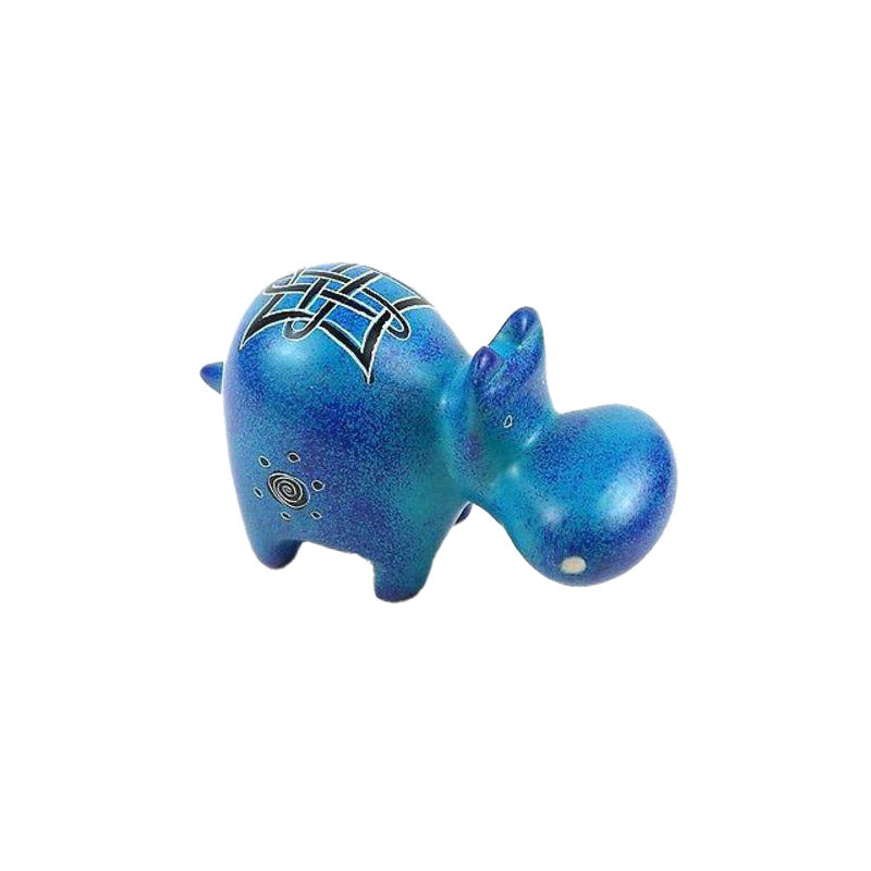 Hand carved from soapstone in Kenya, this hippo is 3 inches tall, by 4 inches long, by 2 inches wide, and is hand painted with a blue abstract design. Please allow for slight variations due to the handmade nature of the piece.