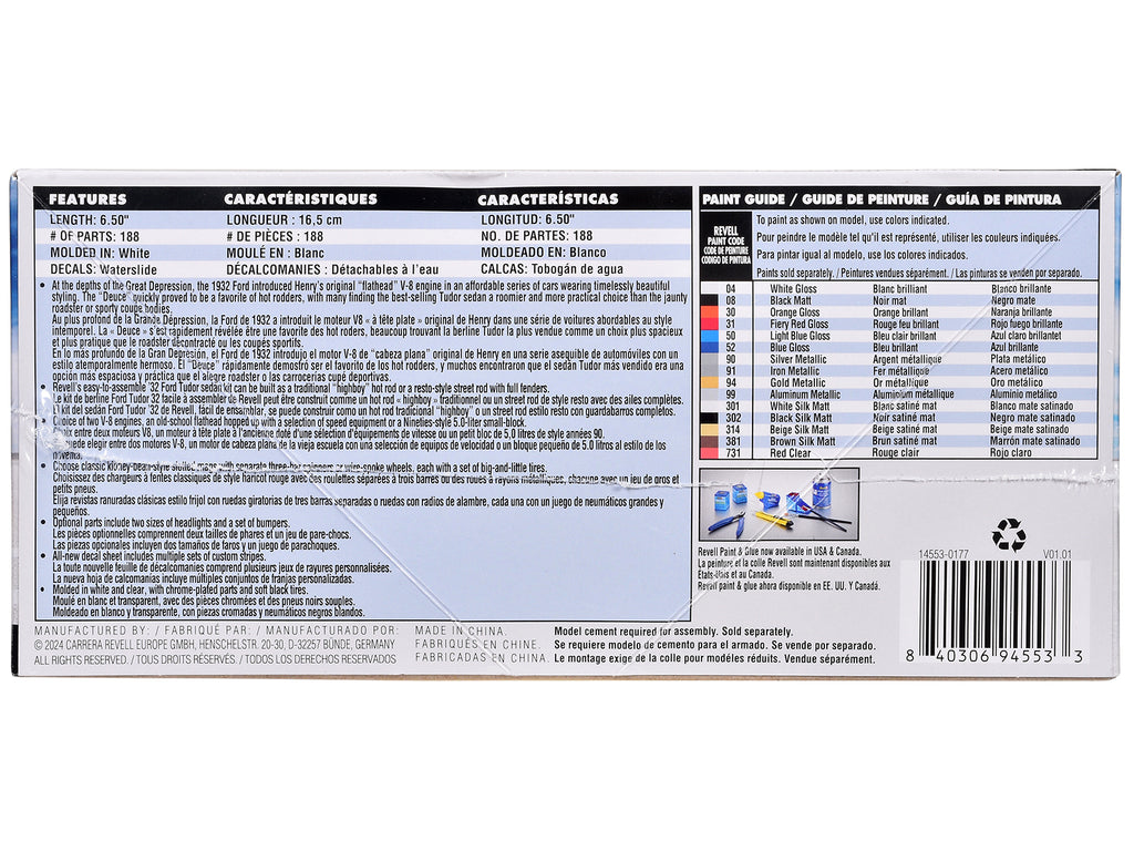 Brand new plastic model kit of 1932 Ford Tudor Sedan 2-in-1 Kit (Level 4) 1/25 plastic model kit by Revell. Brand new box. Soft black tires. Colorful decal artwork. Vintage style packaging. Officially licensed product. Chrome plated small parts. Contains 188 detailed parts. Paint and cement required (not included). Manufacturer's original unopened packaging. Dimensions approximately L-6.5 inches assembled. Parts molded in WHITE, unless otherwise indicated. "Chrome" trim detail can be striped on with silver paint. Optional parts include two sizes of headlights and a set of bumpers. Build your kit one of two ways: Highboy Hot Rod, Resto-Style Street Rod. Choice of two V-8 engines, an old-school flathead hopped up with a selection of speed equipment or a Nineties-style 5.0-liter small-block. Choose classic kidney-bean-style slotted mags with separate three-bar spinners or wire-spoke wheels, each with a set of big-and-little tires.