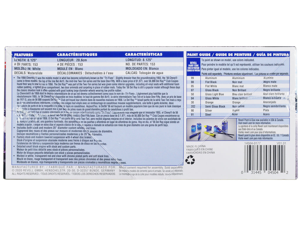 Brand new plastic model kit of 1956 Chevrolet Del Ray 2-in-1 Kit (Level 5) 1/25 plastic model kit by Revell. Brand new box. Soft black tires. Colorful decal artwork. Vintage style packaging. Officially licensed product. Chrome plated small parts. Contains 153 detailed parts. Paint and cement required (not included). Manufacturer's original unopened packaging. Build your kit one of two ways: Stock, Custom. Parts molded in WHITE, unless otherwise indicated. "Chrome" trim detail can be striped on with silver paint. Detailed small block engine with stock and custom parts. Includes both stock and modern 20” diameter custom wheels and tires. Factory stock and modern lowered suspension with 4 wheel disc brakes. Dimensions approximately L-8.125, W-3.125, H-2.375 inches assembled.