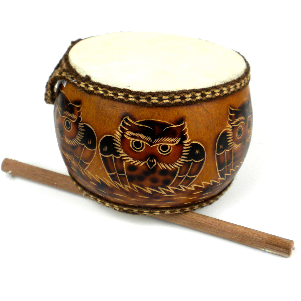 Handmade by Peruvian artisans from a gourd, this cute 4-inch diameter, 3-inch tall drum has two goatskin heads. Adorned with an owl motif achieved with traditional burning techniques, this drum includes a stick and playing instructions.