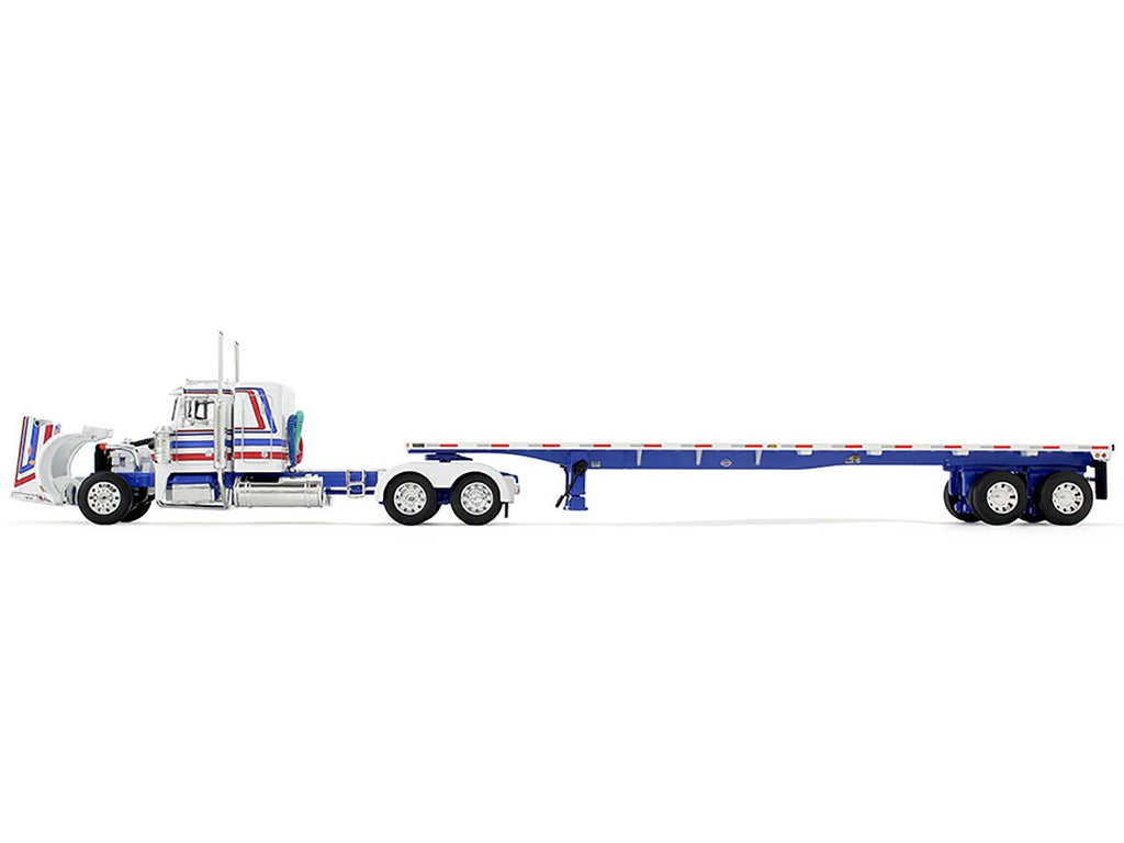 Peterbilt 359 with 36" Flat Top Sleeper and 48' Utility Flatbed Trailer White with Blue and Red Stripes "Bicentennial Patriot" 1/64 Diecast Model by DCP/First Gear