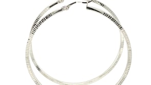 Subtle series of geometric ridges add modern elegance to classic hoop earrings. Earrings are 50 millimeters in diameter, 2 millimeters wide, and are held in place by hinged clasps.