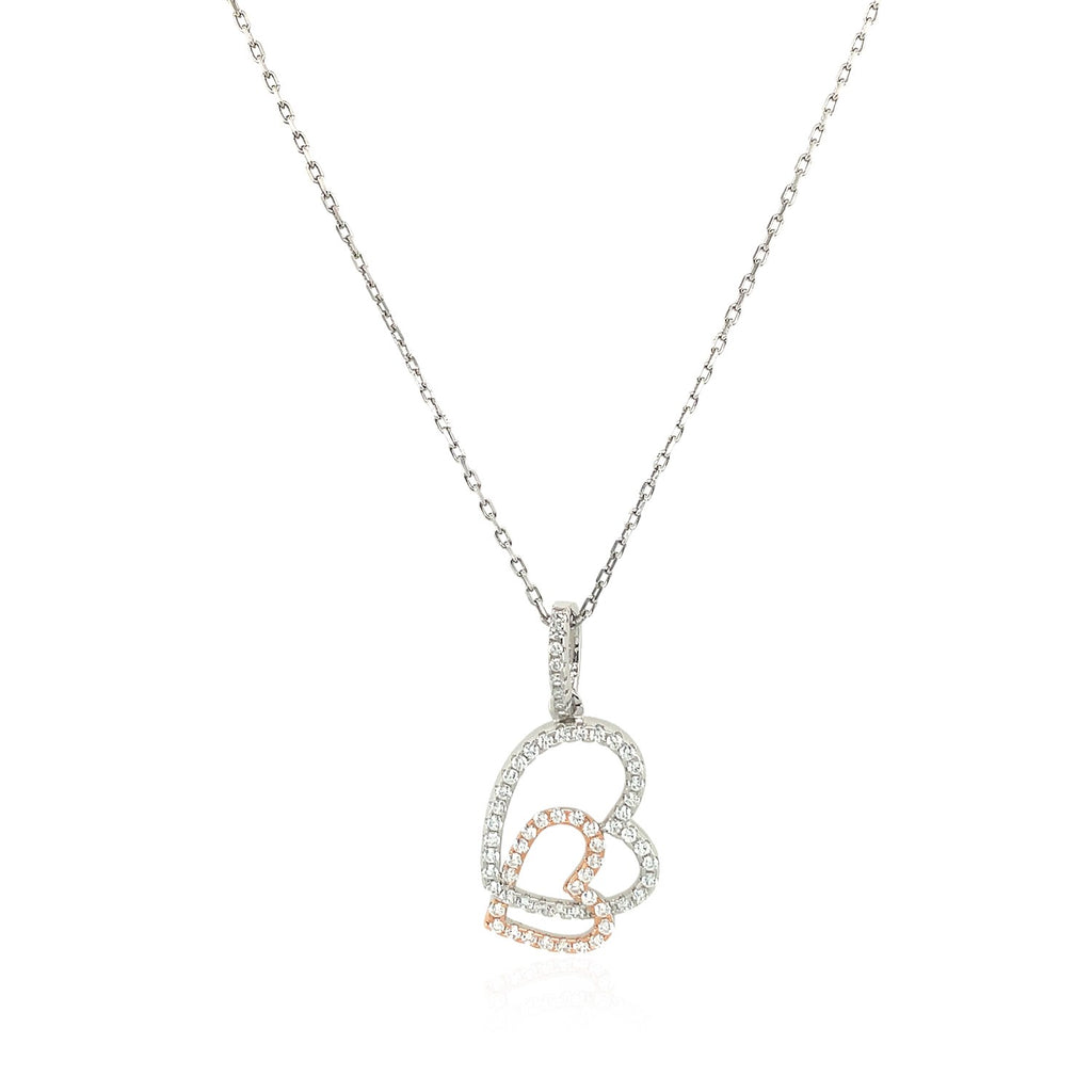 Two exquisite open heart shapes of beautiful white and rose-toned sterling silver sparkle with emotion with the addition of gorgeous cubic zirconias. Necklace is 18 inches long.