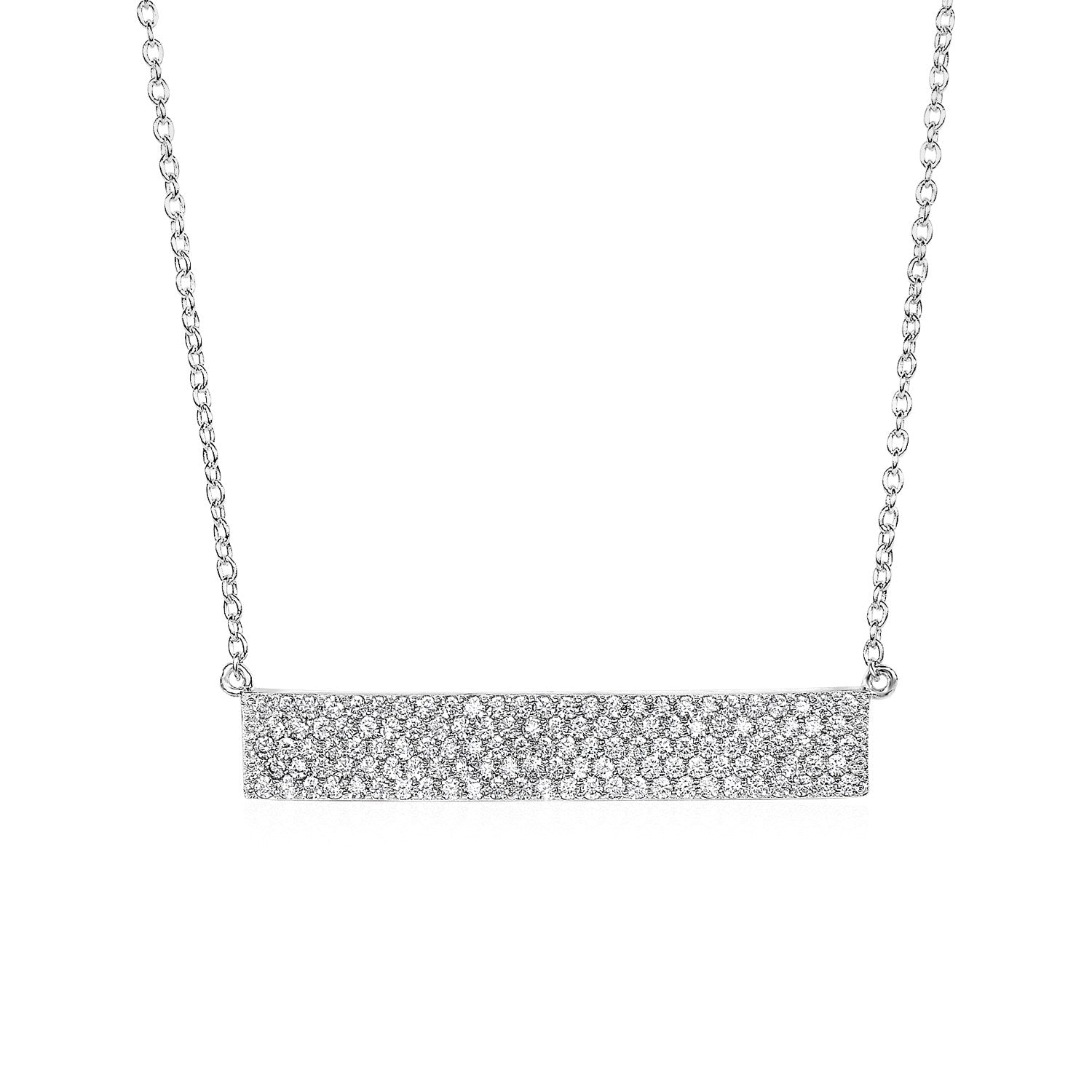 Make a modern, sparkling statement when you wear this sterling silver necklace that features a wide rectangular bar covered with flashing cubic zirconia. Necklace is 18 inches long.